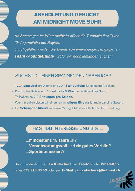 Bei Interesse melde dich bei Jan Kutschera per Telefon unter 079 913 33 53 oder per Mail: jan.kutschera@hotmail.ch